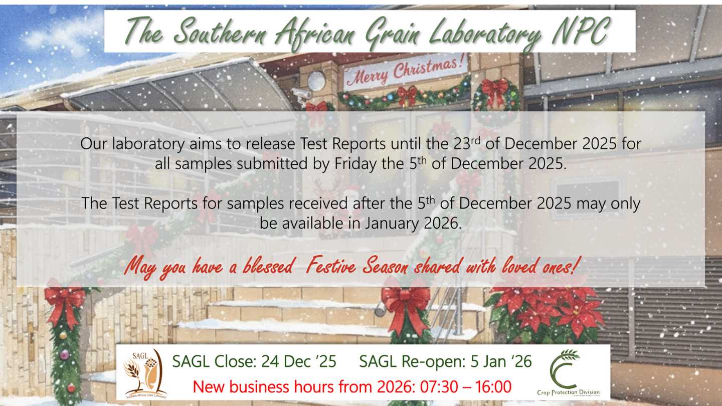 Is an independent non-profit laboratory, created in 1997 by the grain industry to act as a Reference Laboratory for grain and oilseeds. The SAGL provides an internationally competitive range of laboratory services on grain, oilseeds and products thereof including food, feed, and feedstuffs. These services are driven by the needs of the broader grain industry. ISO 17025 accredited test methods are implemented within a comprehensive quality system. The stakeholders serviced by the SAGL include grain and oilseed producers, the handling and storage industry, processors including the baking, milling and animal feed producing industries, traders of agricultural commodities, commercial seed breeding companies, agricultural research institutes and since 2016, also companies producing crop protection products.ANALYSIS / QUOTATION REQUEST